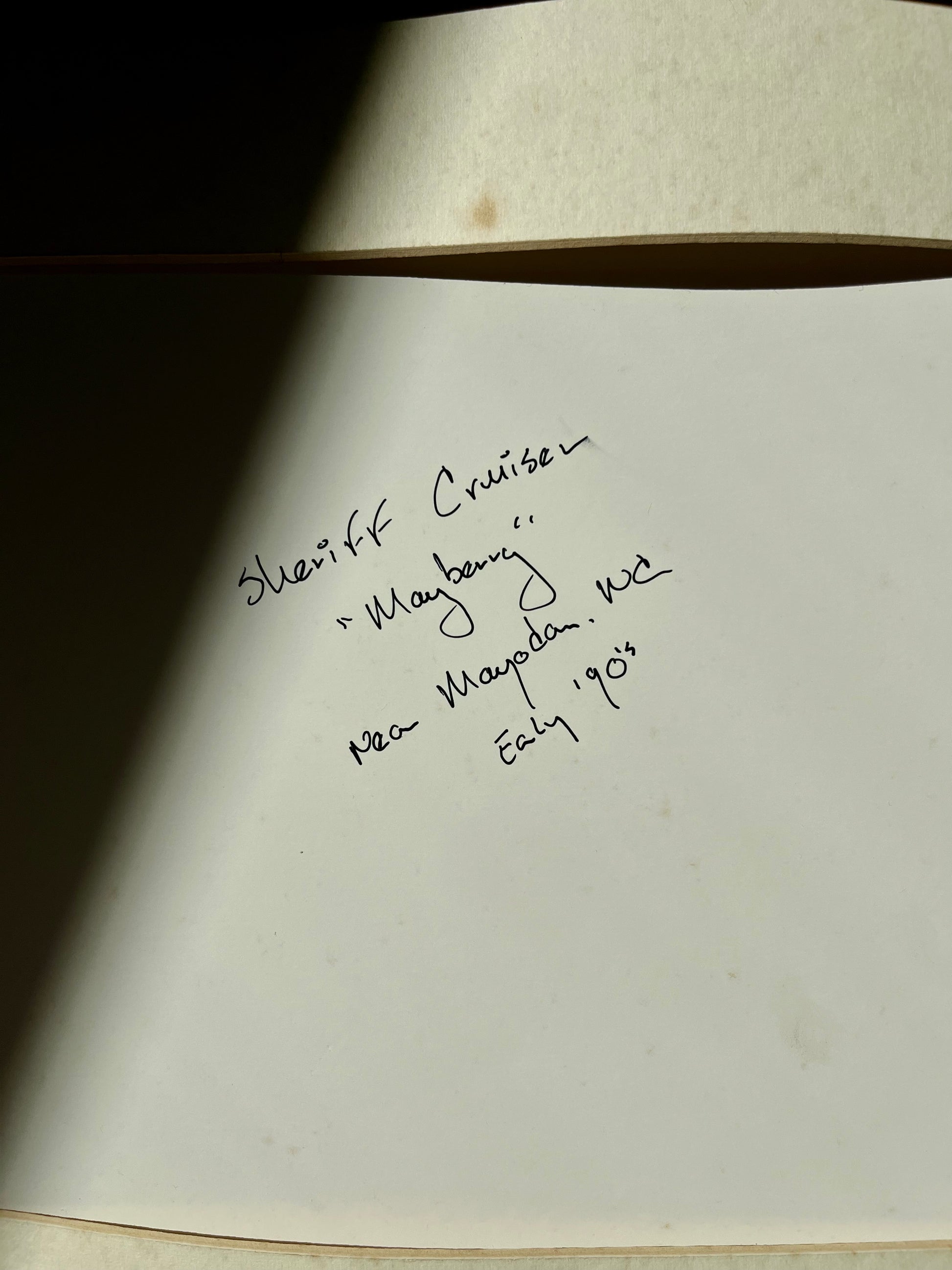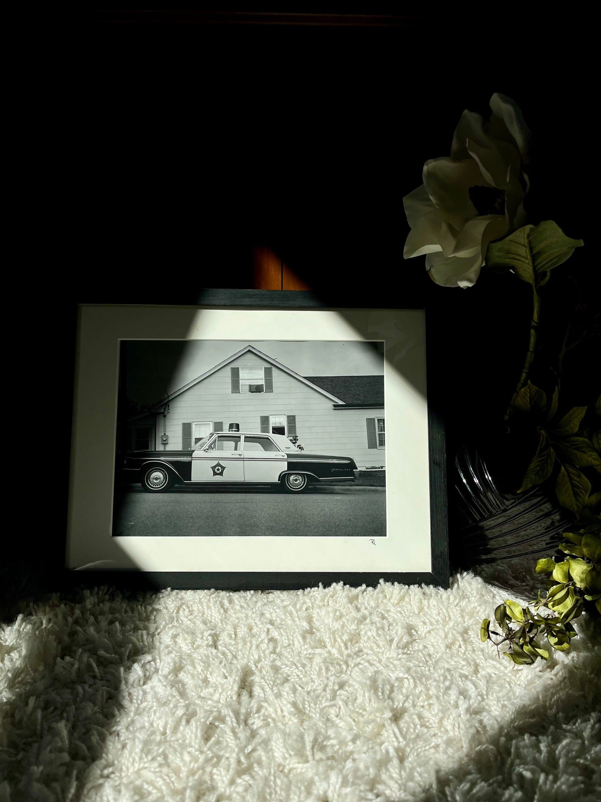 A slice of Americana, frozen in time. This vintage black-and-white photograph captures a classic sheriff’s cruiser parked outside a small-town home near Mayberry, NC in the early 1990s. Shot on film and matted in a simple black frame, it blends nostalgia with a quiet, documentary-style aesthetic.